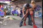 Met een condoom om de steel van de pikhouweel, penetreert de rotzak eerst haar kaal geschoren kut waarna hij haar anus vingert om vervolgens ook haar anus te penetrere