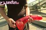 Je weet maar nooit waar je na een lange vlucht terecht komen, De grote rode dildo is om haar poes en kontje mee te verwennen en touw om geile spelletjes mee te s