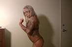 De blonde bodybuildster heeft zo'n grote clit dat ze haar clitoris bijna kan aftrekken. Ze plant haar kale kutje op een stijve pik en word lekker geneukt.