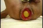 Zonder moeite neukt ze zichzelf met een mega grote dildo, die ze diep in haar anus stopt. Dan stopt de teef een zuigpomp in haar kont en pompt, tot haar anus binnenste buiten is.