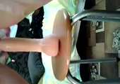 Een vuist dildo op een kruk. Speciaal voor vuistneuken. Dan neemt hij met zijn kont plaats op die enorme dildo. Zijn aars slokt die vuist dildo helemaal op. En wanneer hij rondloopt met die dildo anaal zie je dat zijn pik van stijfheid staat te trillen.