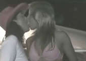 Langzaam gaan de kleren van de geile lesbische vriendinnen uit terwijl ze elkaar filmen, ze strelen en kussen de billen en tepels en likt dan elkaars  kale kutje.