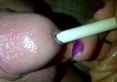 Hij rukt haar kut uit elkaar met de zwarte op pomp dildo