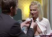Ook in de porno gebeuren er grappige ongelukjes, sex bloopers. Hier word de rondborstige blonde stoot zo hard geneukt dat er wat naar beneden komt.
