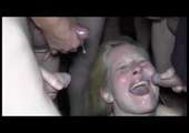 Ze krijgt in deze gangbang haar gezicht vol sperma, ze pijpt en trekt aan de grote lullen tot ze haar gezicht bedekken met een laag sperma.