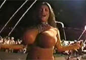 Met alleen nog haar slipje aan, speelt het geile meisje met haar grote tieten voor de webcam.